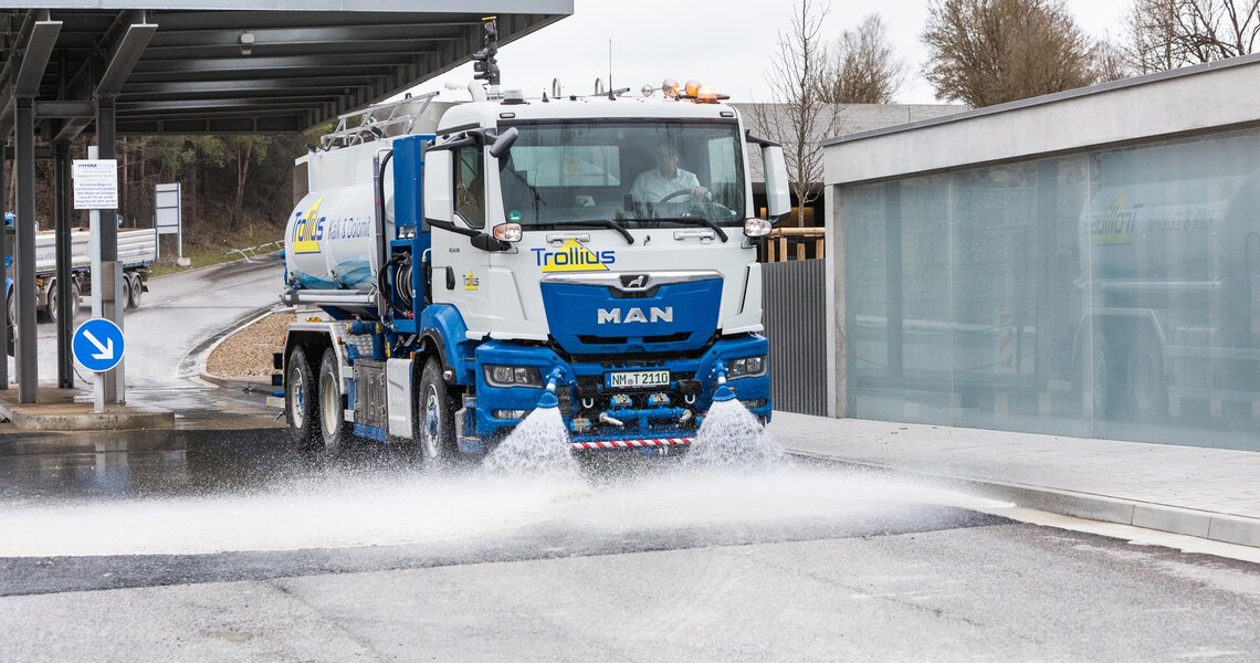 Der Vorratstank fasst bis zu 12.000 Liter Brauchwasser aus einem Absetzbecken, mit dem sich das Fahrzeug selbst befüllt. Die schwenkbaren Froschmauldüsen können mit einem Joystick vom Fahrer gesteuert werden. Sie bringen mit wenig Druck viel Wasser auf die Fahrbahn. Um die Straßen bestmöglich reinigen zu können, gibt es zusätzlich einen schwenk- und absenkbaren Hochdruckbalken. Im Steinbruch selbst sorgen separat schaltbare Düsen dafür, dass die Wege ständig mit Wasser benetzt werden. Mit einem Wasserschlauch und einer Handpistole, die im Wagen bereitstehen, können Geräte und Anlagen gesäubert werden. Zudem gibt es eine auf dem Tank sitzende Wasserlanze, die die Halden im Steinbruch, also das dort aufgeschüttete Gestein, befeuchtet. Das ist deshalb so wichtig, weil genau hier, beim Beladen und Abkippen des Materials, bei trockenem Wetter die höchste Staubentwicklung entsteht. Die Wasserlanze kann ebenfalls vom Fahrersitz aus per Joystick gesteuert und in ihrer Leistung reguliert werden.