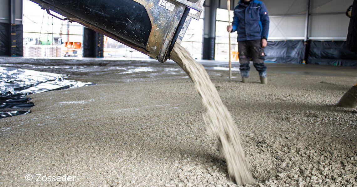 Testbaustelle bei Zosseder Großkarolinenfeld: Der R-Beton wird direkt vom Mischfahrzeug aus verteilt. (Copyright: Zosseder)